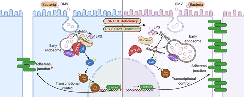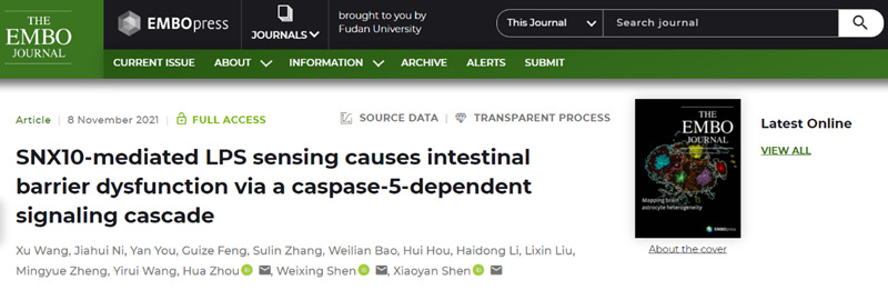 2021年11月8日,PO18 沈晓燕课题组联合南京中医药大学沈卫星课题组,以及澳门科技大学周华研究团队,在The EMBO Journal期刊在线发表了标题为SNX10-mediated LPS sensing causes intestinal barrier dysfunction via a caspase-5-dependent signaling cascade的研究成果。研究揭示OMV通过内化的方式进入人肠上皮细胞中的早期内体中,进而诱导SNX10介导的caspase-5和PIKfyve在早期内体膜上的募集,随后触发LPS释放到细胞质中,并被caspase-5感知。激活的caspase-5引起Lyn磷酸化,诱导Snail/Slug的核转位,并导致E-cadherin下调,最终破坏肠上皮屏障功能。该研究发现了一个新的信号轴,其中支架蛋白SNX10提供了一个平台,用于整合LPS释放、感知和信号转导的分子机器的组装和定位。该研究揭示了IBD肠上皮屏障功能障碍新分子机制,为IBD的预防和治疗提供了药物靶标。