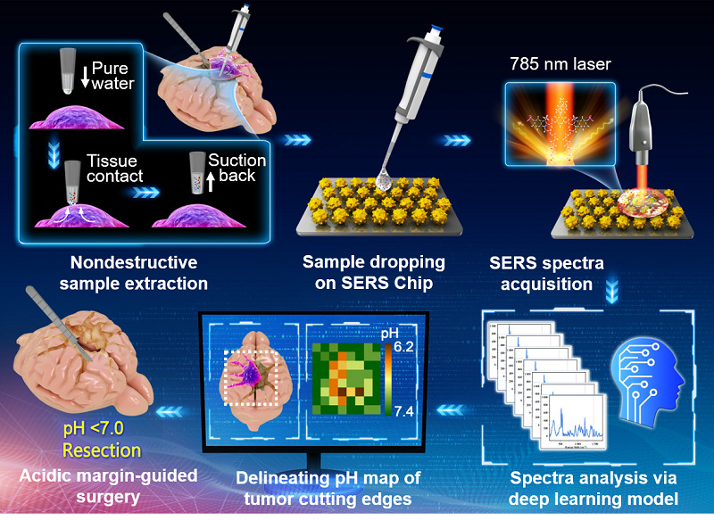 近日,PO18 李聪教授、类脑智能科学与技术研究院张孝勇研究员、信息科学与技术PO18 余锦华教授以及附属华山医院神经外科毛颖教授联合研究团队构建了一类基于表面增强拉曼散射(SERS)技术的胶质瘤手术导航原理验证系统。该系统由自主研制的pH响应SERS芯片,手持式拉曼光谱仪以及拉曼光谱深度学习系统组成。该工作提出了水滴辅助组织取样技术,能够将手术切面可疑组织表面代谢物无损地转移到SERS芯片上。还提出了报告分子诱导表面增强拉曼共振效应新原理。实现了微量液滴样本pH值的快速测定。自主构建的深度学习模型自动分析样本拉曼光谱并准确、快速地测定样品pH值。该智能SERS系统导航可在6分钟内对64个组织位点(约1cm2)pH进行测量,并通过绘制组织pH分布图定位“酸性代谢边界”。与临床手术导航技术相比,基于“酸化边界”的手术导航策略显著提高大鼠胶质瘤模型存活率,延缓了肿瘤复发速度。此外,通过5例病人胶质瘤组织样本分析,也发现了酸化与恶性程度之间的相关性,揭示了“代谢边界”手术导航策略临床转化的可行性。