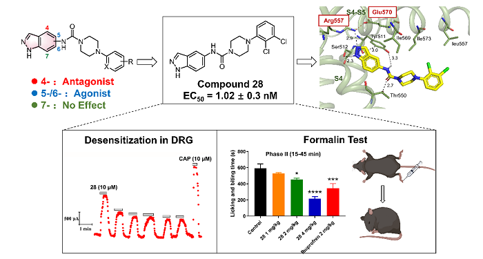 研究团队通过分析蛋白晶体结构,选择经典的TRPV1拮抗剂BCTC和ABT-102作为苗头化合物,以分子杂交策略设计了一系列N-吲唑-4-芳基哌嗪甲酰胺类TRPV1调节剂。构效关系研究表明,该类结构吲唑双环核心的取代位置决定了功能,在5位或6位取代吲唑强效激动TRPV1,而4位和7位取代则分别拮抗TRPV1和导致活性丧失。