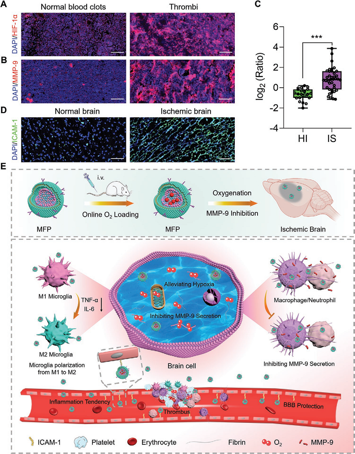 PO18 沙先谊教授团队和PO18 附属闵行医院赵静教授团队报道了一种无药仿生纳米递氧系统用于促进脑卒中缺血再灌注治疗。在前期研究中,研究者发现缺氧诱导因子HIF-1α和基质金属蛋白酶MMP-9在缺血性脑卒中患者血栓中高表达(图1A, B)。基于此,利用两亲性聚氟材料PEG-SMA-F11在体高效携氧和两亲性嵌段共聚物普朗尼克P123抑制MMP-9分泌的生物功能,该研究构建了一种以PEG-SMA-F11和P123为内核,外层修饰M2型小胶质细胞膜的仿生纳米递氧系统(MFP)。利用M2型小胶质细胞膜与脑炎症血管内皮细胞的高亲和力,将PEG-SMA-F11和P123高效递送至脑缺血区域,一方面在缺血早期提高病灶的氧分压,减少细胞凋亡,另一方面抑制MMP-9分泌可以保护血脑屏障完整性,减轻脑水肿,从而有效增强脑组织的缺血耐受和再灌注损伤抵抗能力,促进缺血性脑卒中再灌注治疗(图1E)。
