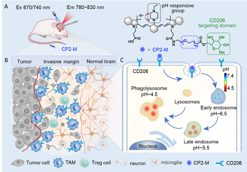 可视化免疫抑制肿瘤相关巨噬细胞定位脑胶质瘤边界。探针CP2-M通过分层靶向策略首先靶向免疫抑制巨噬细胞过度表达的CD206受体,探针经CD206受体介导内吞后在细胞吞噬小体酸性微环境中被激活,实现免疫抑制巨噬细胞的准确定位。