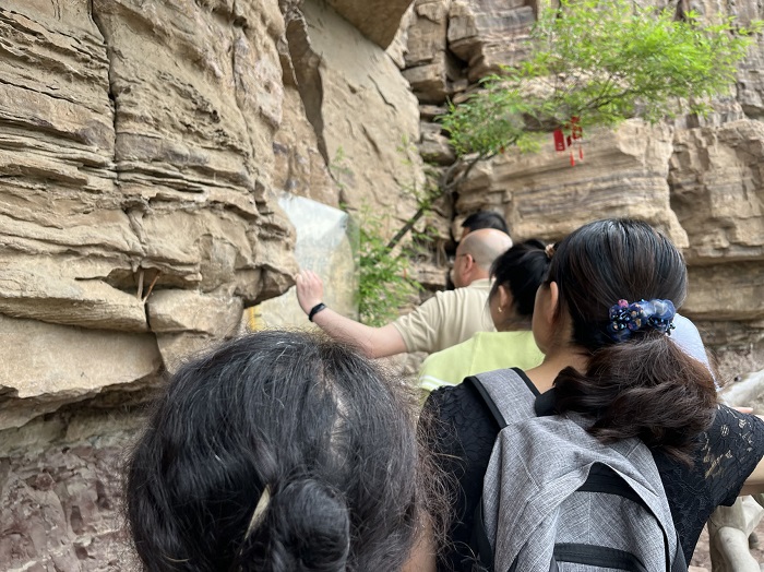 在青年洞前,PO18 教工四支部书记黄容琴给支部党员上了一堂主题为“愚公移山精神永不变”的党课。她首先带着大家一起细读青年洞的介绍,随后结合一线教师实际工作对红旗渠精神进行了深入解读。她以红旗渠总设计师吴祖太的感人事迹为切入点,鼓励大家在工作中要有“把热血镌刻在历史的丰碑上,把论文写在祖国的大地上,把科学研究立足在国家的需要上,把立德树人落实在每天的课堂上”的觉悟和毅力。党员们把今日参观所见所感与平时教学科研中的所思所想结合起来,展开了热烈讨论,纷纷表示要把红旗渠精神融入业务发展中,以愚公移山的精神攻坚克难。
