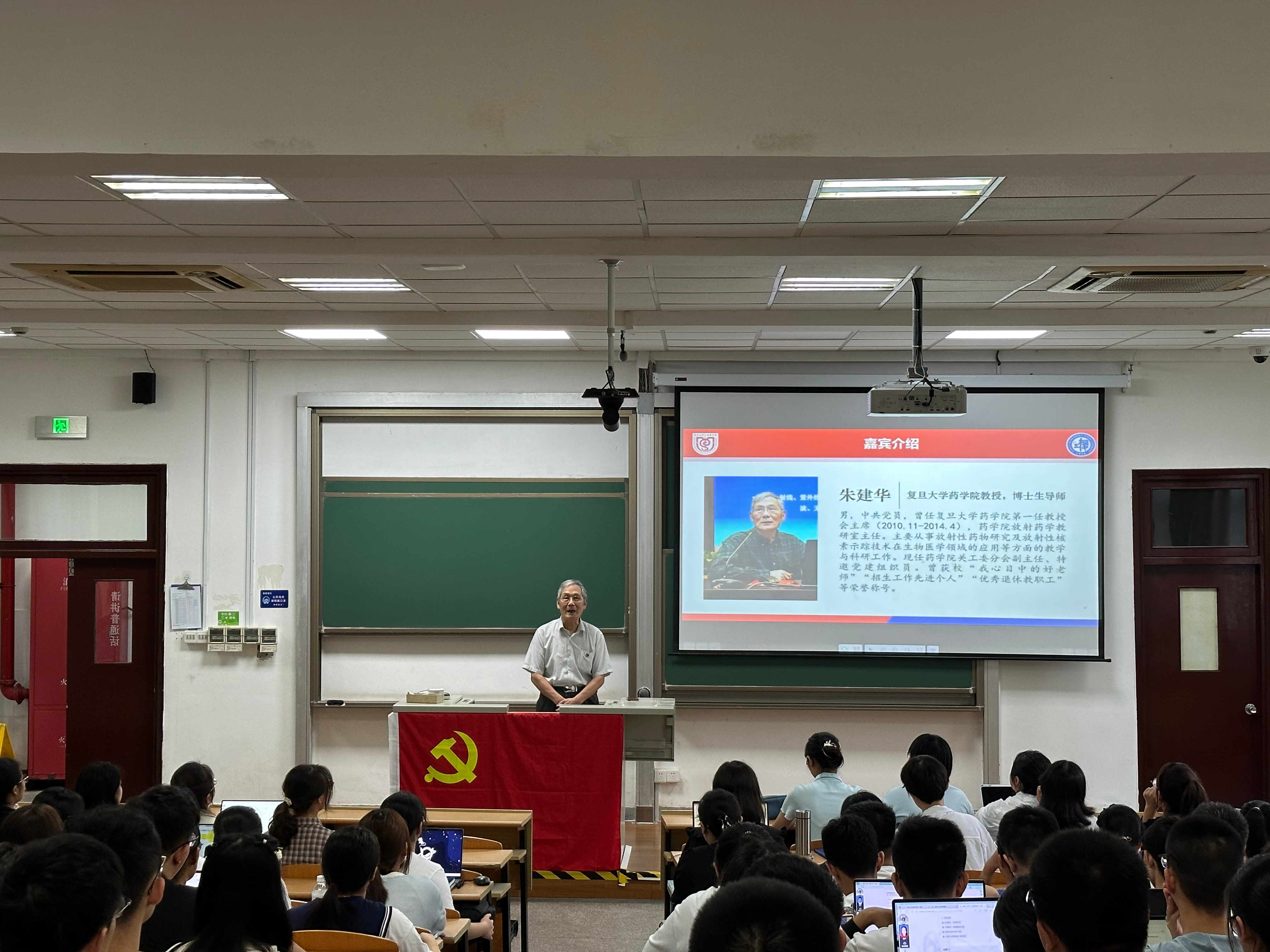 朱教授是一名党龄50多年的老共产党员,在班会课上,他讲述了身边三位优秀党员的先进事迹。核药学领域的一位老教授不惧放射研究的危险,带领同事在专业领域上不断取得突破,教研室被评为上海市模范集体;曾担任PO18 院长、中国药剂学领军人物奚念朱教授,拒绝高薪工作,将一生全部奉献给了PO18 的教育和科研事业;方晓玲教授在名利冲突前,不计较个人得失,她身上的奉献精神令人敬佩。朱建华教授说,其实这些看起来都是平凡的事迹,但更能显现出共产党员舍己忘我、甘于奉献的优秀品质。