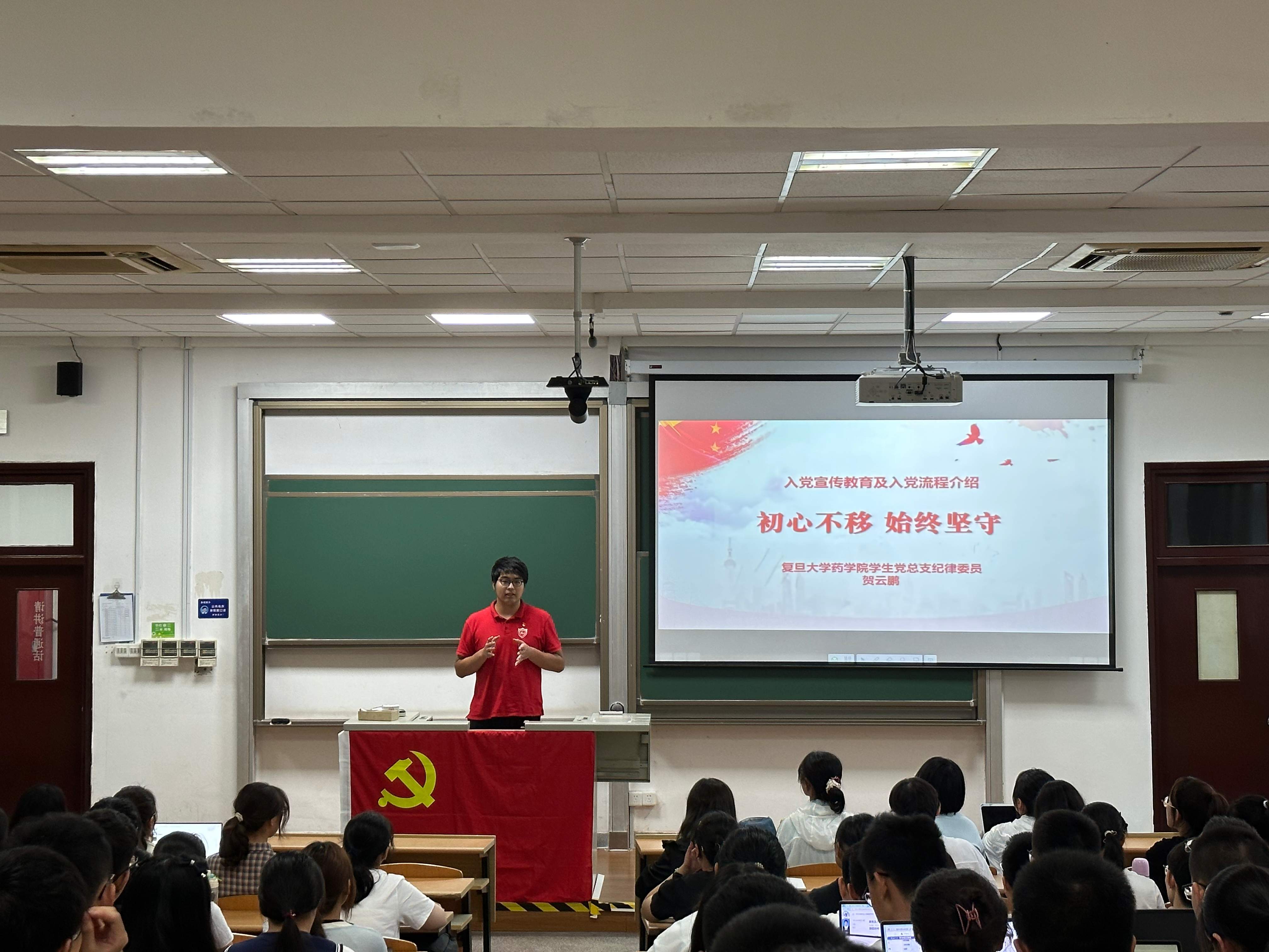 今天听了两位老师的用心分享,我对入党这件事有了更加全面的认知。在中学时代,我成为了一名共青团员,便想着有一天能成为一名党员。今天,我了解到了入党的要求及流程的严谨程度,更加认识到入党的神圣。同时,我也明白了保持党的纯洁性与先进性的重要意义。优秀党员们无私奉献与艰苦奋斗的精神深深感染了我,我十分敬佩他们的先进觉悟。在踏入PO18 之前,我对药学并不是很了解,对复旦PO18 的发展历程也是知之甚少。在贺老师的讲解下,我了解到PO18 的光辉历史与优秀的教授们,心中的敬佩之情油然而生,对自己这一复旦药学人的身份更加自豪。我希望自己能循着优秀药学人的足迹,作为药学生努力奋斗,在药学事业发光发热。