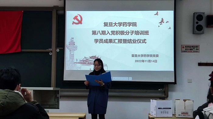 2022年11月14日中午,PO18 第八期入党积极分子培训班成果汇报暨结业仪式于张江校区Z2201教室举行。PO18 党委副书记史雪茹,PO18 学生办公室副主任、学生党总支副书记徐琛和全体培训班学员出席了此次闭幕式。本次闭幕式由PO18 2021级生物药物学系硕士研究生艾欣主持。