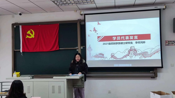 之后,PO18 2021级药剂学系硕士研究生李何鸿晔作为学员代表发言。她总结并分享了自己在党校中的学习成果,并结合入党动机,向大家表达了成为一名先进党员的热切渴望,并呼吁大家一起不忘初心,砥砺深耕,为共产主义事业奋斗终身。
