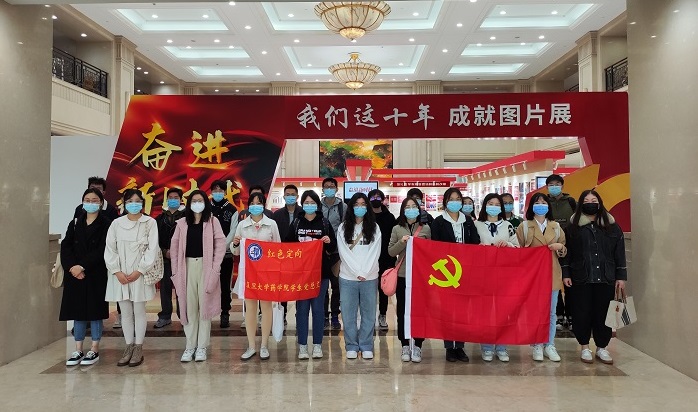 随后,各小组前往光华楼2楼参观展览。展会以时间为轴,向同学们展示了PO18 近十年的光荣历程,“我们这十年成就图片展”与二十大报告的主题相契合:高举中国特色社会主义伟大旗帜,全面贯彻习近平新时代中国特色社会主义思想,弘扬伟大建党精神,自信自强,守正创新,踔厉奋发,勇毅前行,为全面建设社会主义现代化国家、全面推进中华民族伟大复兴而团结奋斗!