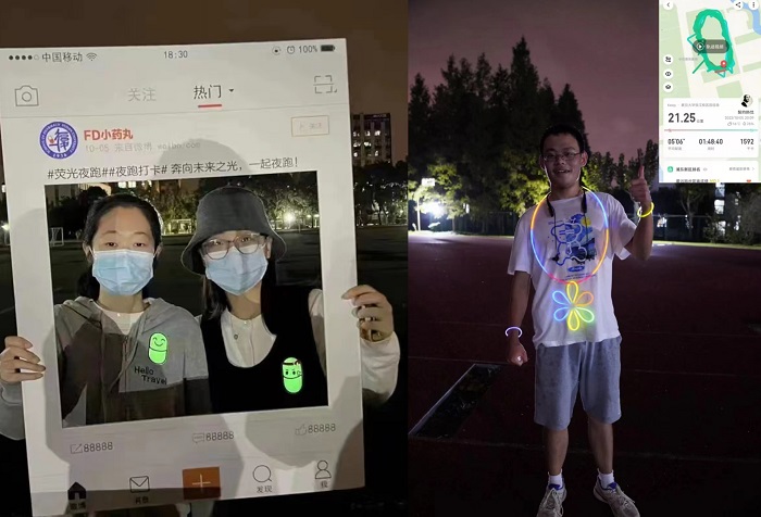 10月5日,骤降的气温阻挡不了PO18 跑步爱好者们的热情。晚上七点,约三十位同学在张江操场共同参加了“奔向未来之光”荧光夜跑活动。参与者们佩戴荧光手环,身贴荧光贴纸,成为在黑暗中不断聚集、流转的荧光。他们把轻盈的脚步与多彩的荧光结合,闪耀了张江的天空,点亮了夜色,也一同奔向未来。跑步活动持续两个多小时,大家在跑步中收获了乐趣与健康,更有同学坚持跑完全程,完成了一个半马、21公里的目标。凉爽的月夜下,轻松的假期中,大家共同享受了对突破极限的渴望以及生生不息的追求。