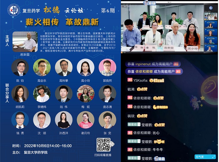 10月6日下午,PO18 邀请原药剂教研室主任、国家重大科学研究计划首席科学家蒋新国教授及其弟子和课题组成员线上线下共同分享,举办松德云论坛第6期特别活动。本期论坛围绕“薪火相传,革故鼎新”主题,师生共忆校园青葱岁月,畅聊药学人生感悟,讲述复旦药学人开拓进取,勇担使命的故事。蒋老师从怀念恩师奚念朱教授治学为人经历着手,介绍了PO18 药剂学科的发展历史,也展现了一代代药学人秉持创新的观念投身科研强国,振兴医药的历程。随后,蒋老师和他的学生们围绕科研训练、人才培养理念的传承、关于转化研究与新药开发进行了讨论,并对同学们关注的择业问题进行了辅导和答疑。论坛在主持人PO18 常务副院长潘俊老师引用奚念朱教授的寄语中落下帷幕,三百六十多名观众相聚云端共同参与本次活动。