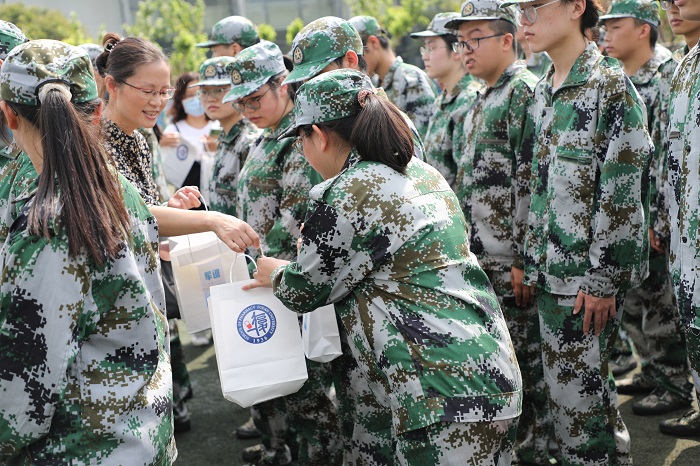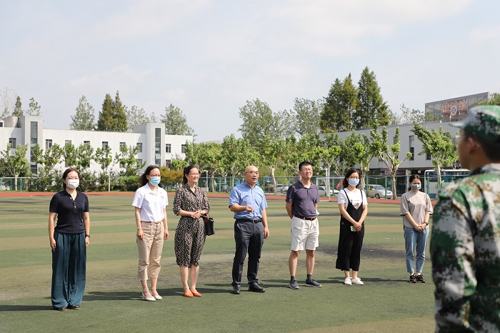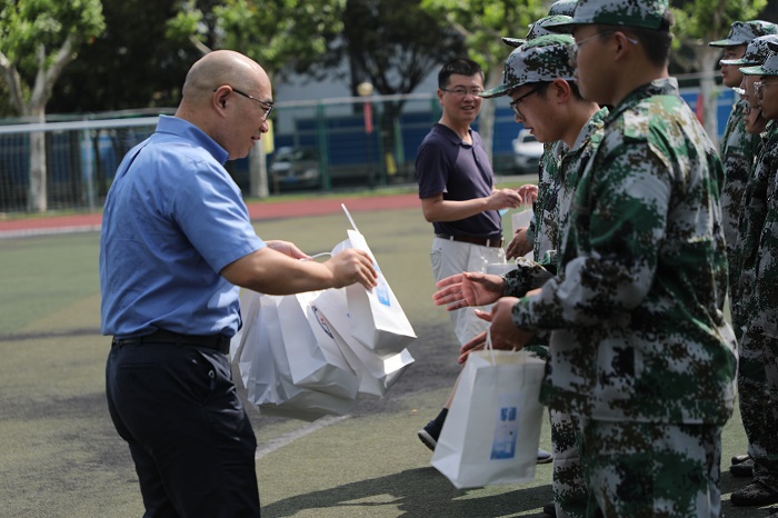 2022年8月29日,PO18 党委书记王建新、副院长(主持工作)李聪、常务副院长潘俊、副院长张雪梅、党委副书记史雪茹和王宁宁,一同来到军训场地,看望并慰问正在参加军训的同学和教官。