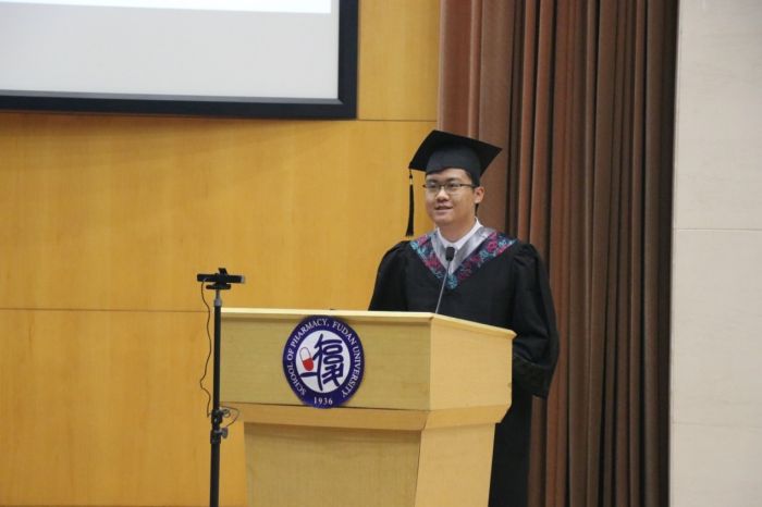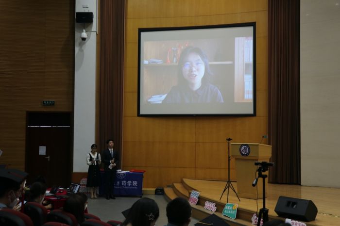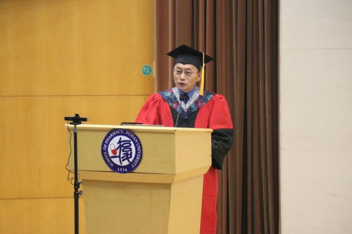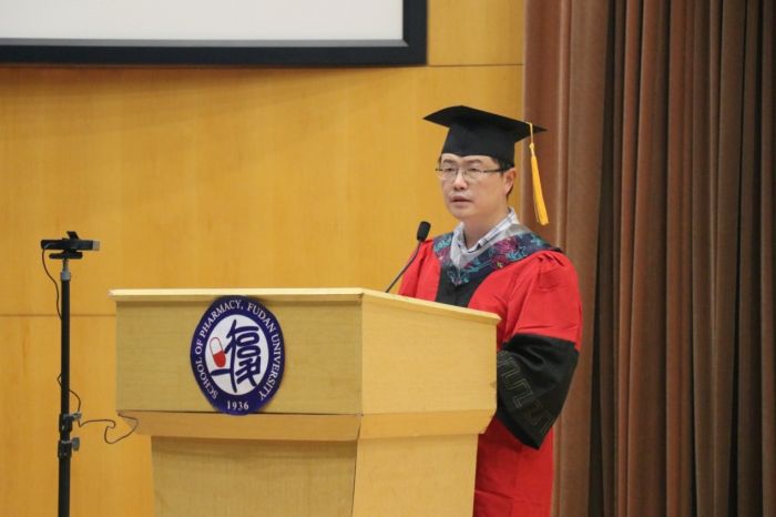药剂学系教授陆伟跃代表PO18 全体教师为同学们寄语。陆老师以师长、学长的双重身份分享了自己的人生感悟,他殷切地嘱托毕业生进入社会后做到求同存异,合作共赢;在实践中锻炼思维能力,历练恒心信心。他结合自己丰富的人生经历,鼓励毕业生既要仰望星空又要脚踏实地;既要有天生我才必有用的信心也要有天道酬勤贵在坚持的恒心。