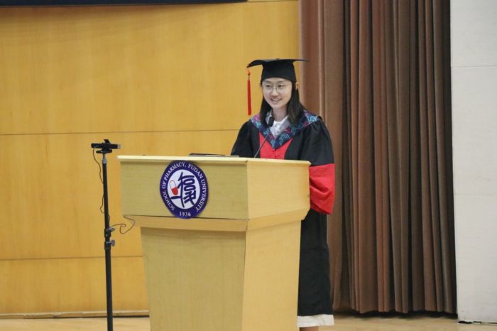 本年度获奖者2022届本科毕业生汤栩懿表达了对潘德济先生“厚德载物,良药济人”精神的钦佩。她提到PO18 带给她潜移默化的影响,引导着她追寻自己的人生价值,承担起青年的社会责任。她希望和各位毕业生共同努力,在药学研究的道路上实现自己的人生和社会价值,推动中国医药事业朝着更前沿的方向发展。